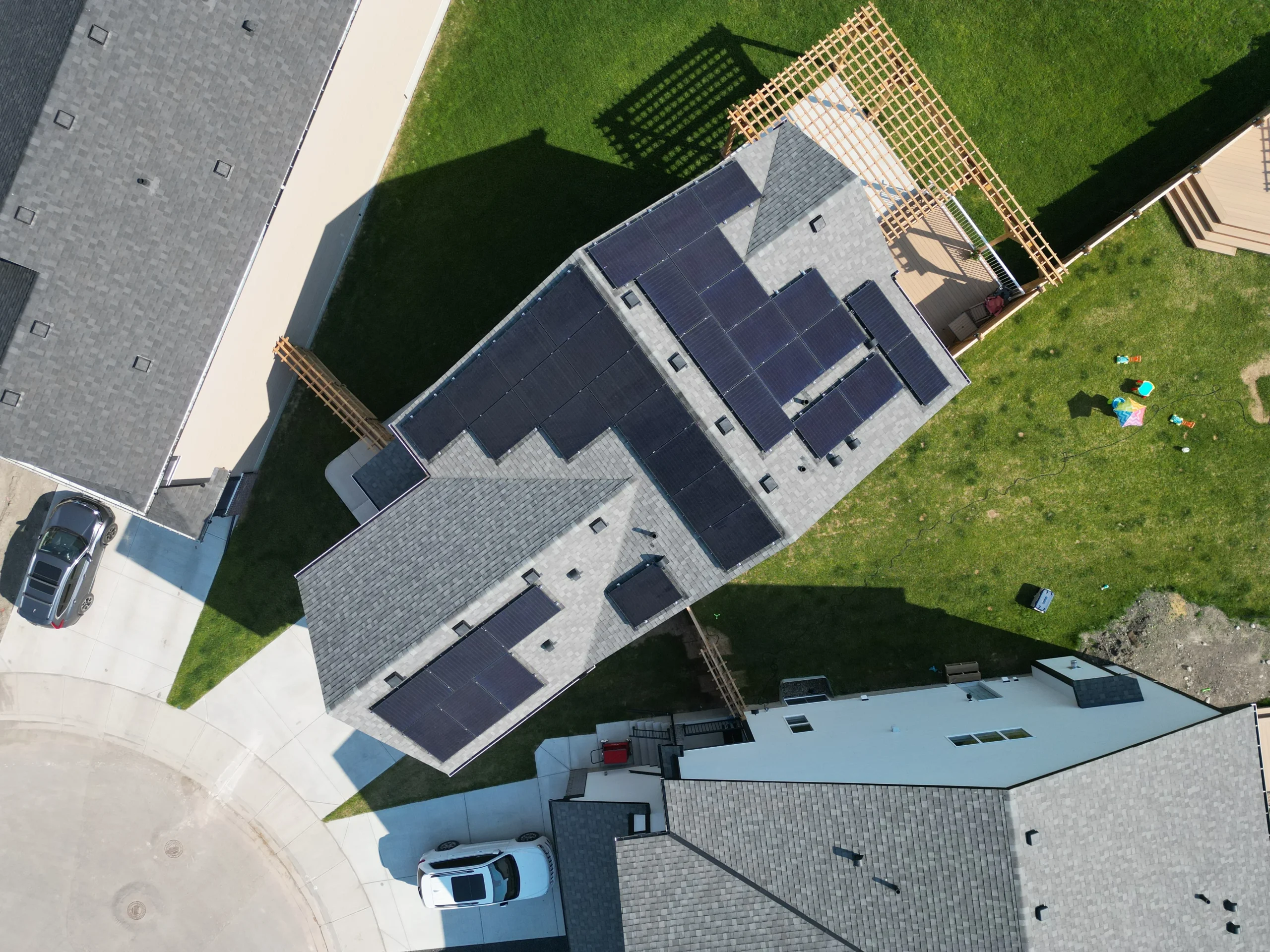 We designed a 14.76kW DC solar array utilizing Longi Solar 410W Black Modules with Enphase IQ8+ microinverters producing a peak 10.8kW AC power and 14,800kWh/year.